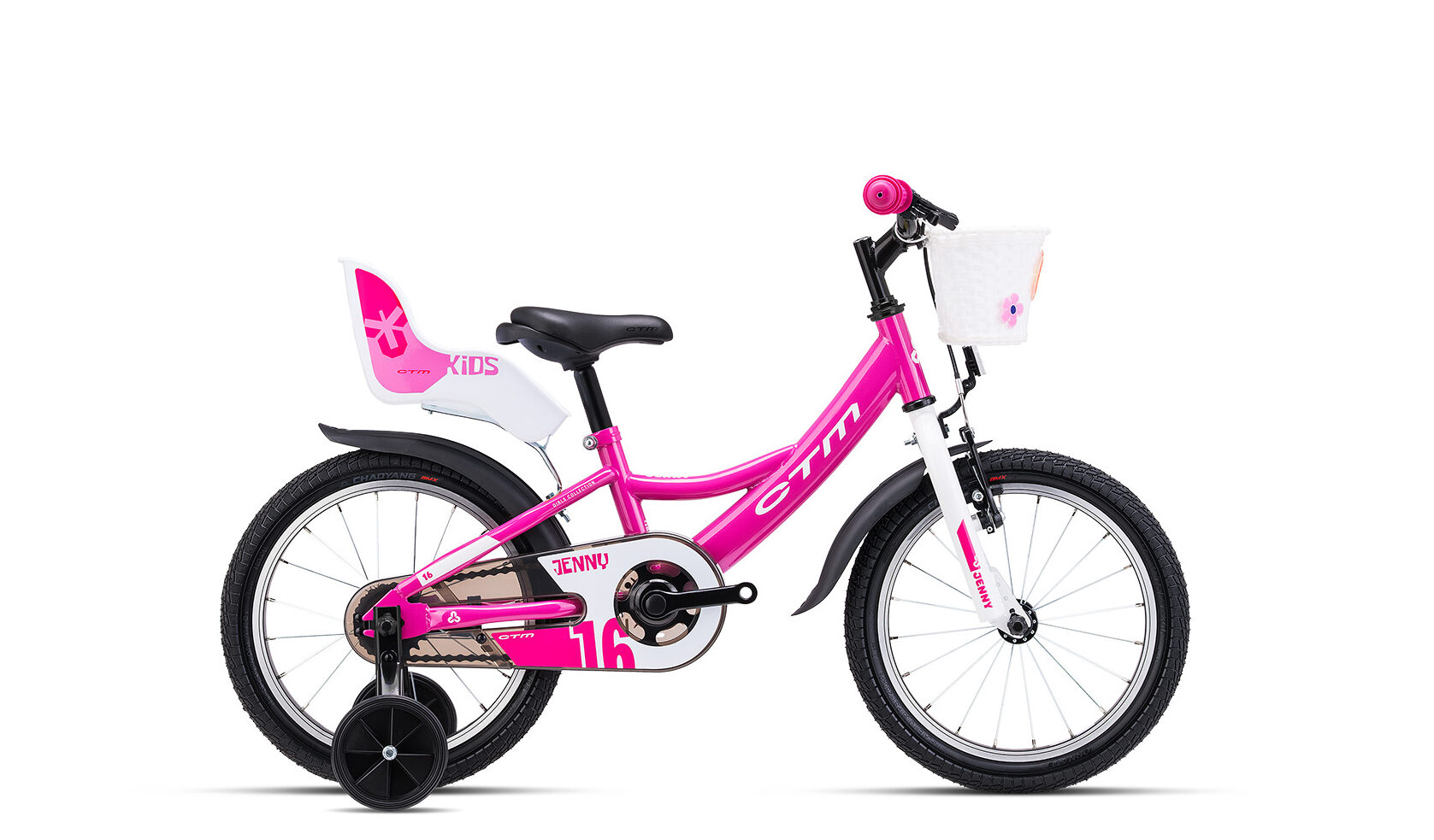 CTM Jenny je detský dievčenský bicykel so 16-palcovými kolesami,pomocnými koliesami, blatníkmi,detskou sedačkou pre bábiku, torpédom (brzdí šliapaním dozadu) a prednou brzdou na riadidlách pre nácvik klasického brzdenia.