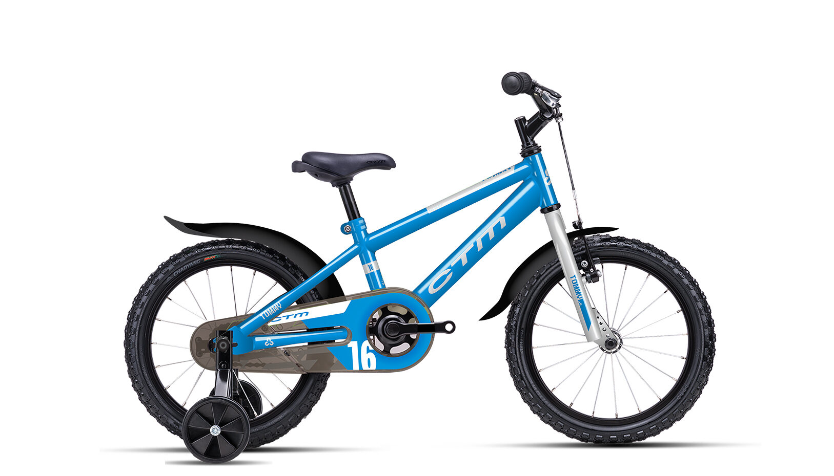 CTM TOMMY 16″ je detský bicykel s pomocnými kolieskami, 16″palcovými kolesami, torpédom (brzdí šliapaním dozadu) a prednou brzdou na riadidlách pre nácvik klasického brzdenia.